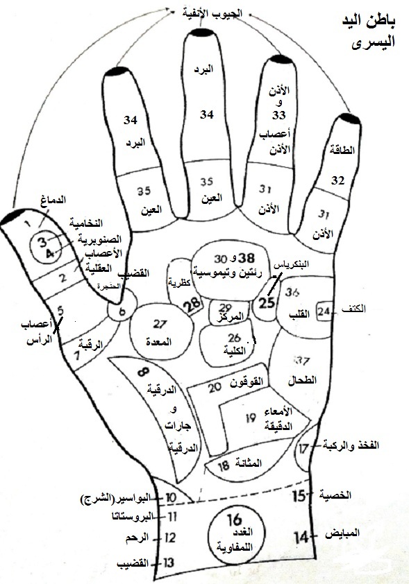 الأصيل في الطب البديل صورة رقم 002 أ نقاط التدليك الانعكاسي على باطن اليد اليسرى
