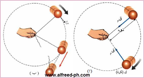 أما القوة المركزية تساوي القوة الطاردة المركزية ولكن في عكس اتجاهها يعني 100n إذا محصلة القوى تساوي صفرا وهذا يعني حسب قانون نيوتن أن الجسم يجب أن يتحرك بخط مستقيم وسرعة ثابتة وليس في دائرة هذه هي حركة المقلاع.