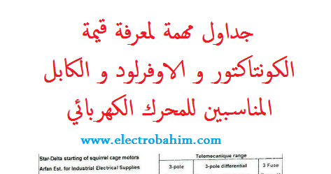 جداول مهمة لمعرفة قيمة الكونتاكتور و الاوفرلود و الكابل المناسبين للمحرك الكهربائي